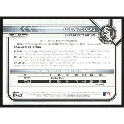 This is a 2022 Bowman Draft Oscar Colas baseball card. The card is #BD-51 and pictures show condition.