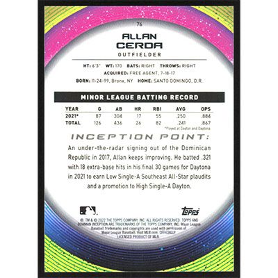 This is a 2022 Bowman Inception Orange Allan Cerda baseball card. The card is #76 and pictures show condition. This card is limited; #'d 15/25. Team(s): Cincinnati Reds