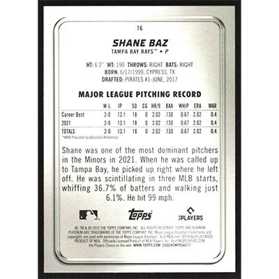 This is a 2022 Bowman Platinum Shane Baz baseball card. The card is #76 and pictures show condition.