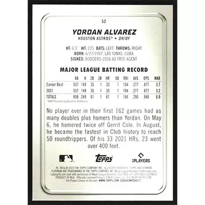 This is a 2022 Bowman Platinum Ice Yordan Alvarez baseball card. The card is #52 and pictures show condition.