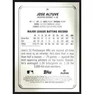 This is a 2022 Bowman Platinum Ice Jose Altuve baseball card. The card is #95 and pictures show condition.