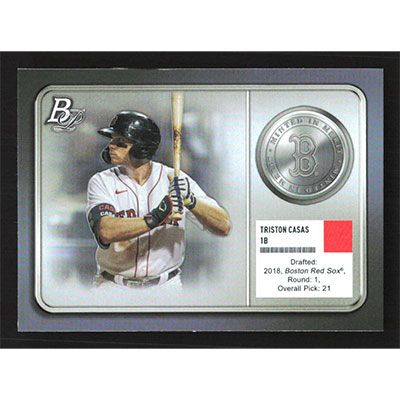 This is a 2022 Bowman Platinum Minted in Merit Triston Casas baseball card. The card is #MM-7 and pictures show condition.