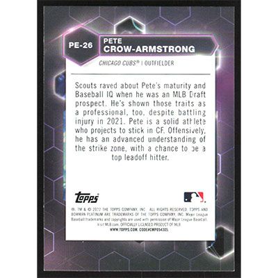 This is a 2022 Bowman Platinum Precious Elements Pete Crow-Armstrong baseball card. The card is #PE-26 and pictures show condition.
