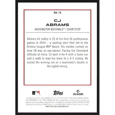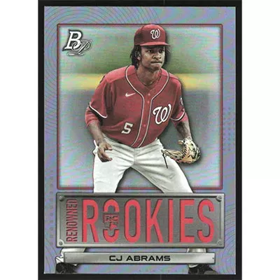 This is a 2022 Bowman Platinum Renowned Rookies CJ Abrams baseball card. The card is #RR-19 and pictures show condition. Team(s): Washington Nationals Rookie Card (RC)