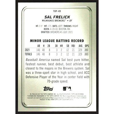 This is a 2022 Bowman Platinum Top Prospects Emerald Ice Foilboard Sal Frelick baseball card. The card is #TOP-49 and pictures show condition. This card is limited; #'d 060/299.