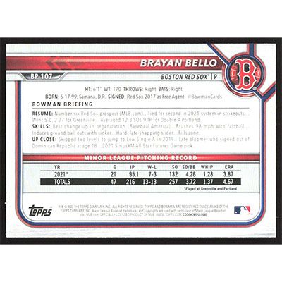This is a 2022 Bowman Prospects Brayan Bello baseball card. The card is #BP-107 and pictures show condition.