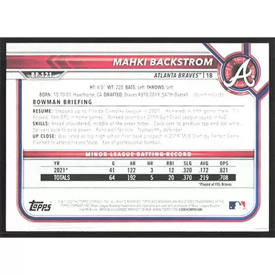 This is a 2022 Bowman Prospects Mahki Backstrom baseball card. The card is #BP-121 and pictures show condition.