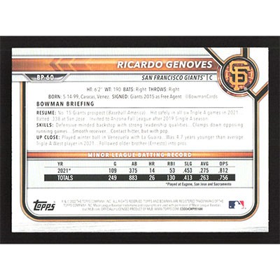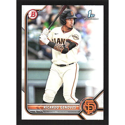 This is a 2022 Bowman Prospects Ricardo Genoves baseball card. The card is #BP-60 and pictures show condition.