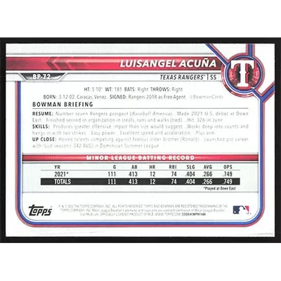 This is a 2022 Bowman Prospects Luisangel Acuña baseball card. The card is #BP-72 and pictures show condition.