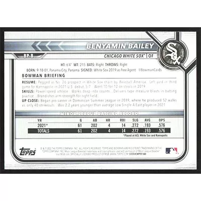 This is a 2022 Bowman Prospects Benyamin Bailey baseball card. The card is #BP-8 and pictures show condition.