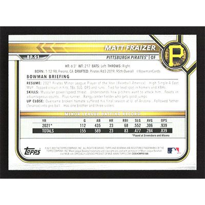 This is a 2022 Bowman Prospects Matt Fraizer baseball card. The card is #BP-91 and pictures show condition.