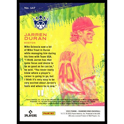 This is a 2022 Diamond Kings Jarren Duran baseball card. The card is #147 and pictures show condition.
