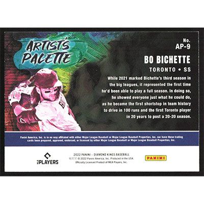 This is a 2022 Diamond Kings Artist's Palette Bo Bichette baseball card. The card is #AP-9 and pictures show condition.
