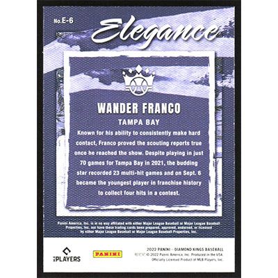 This is a 2022 Diamond Kings Elegance Wander Franco baseball card. The card is #E-6 and pictures show condition. Team(s): Tampa Bay Rays Rookie Card (RC)