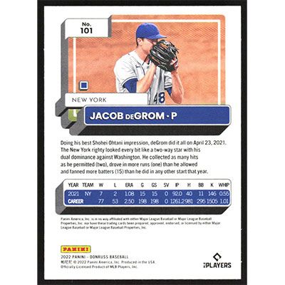This is a 2022 Donruss Holo Blue Jacob deGrom baseball card. The card is #101 and pictures show condition.