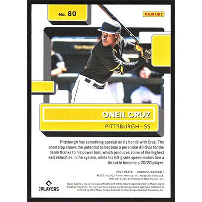 This is a 2022 Donruss Holo Blue Oneil Cruz Rated Rookie baseball card. The card is #80 and pictures show condition. Team(s): Pittsburgh Pirates Rookie Card (RC)