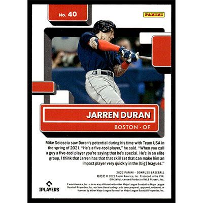 This is a 2022 Donruss Holo Orange Jarren Duran Rated Rookie baseball card. The card is #40 and pictures show condition. Team(s): Boston Red Sox Rookie Card (RC)