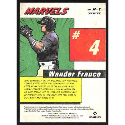 This is a 2022 Donruss Marvels Diamond Wander Franco baseball card. The card is #M-8 and pictures show condition. Team(s): Tampa Bay Rays Rookie Card (RC)