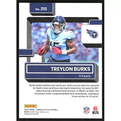 This is a 2022 Donruss Optic Treylon Burks Rated Rookie football card. The card is #212 and pictures show condition. Team(s): Tennessee Titans Rookie Card (RC)