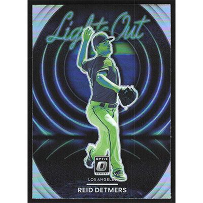 This is a 2022 Donruss Optic Lights Out Holo Reid Detmers baseball card. The card is #LO-3 and pictures show condition. Team(s): Los Angeles Angels Rookie Card (RC)
