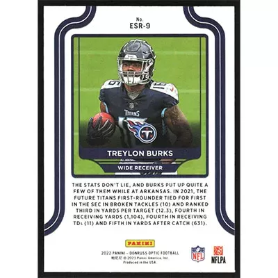 This is a 2022 Donruss Optic The Elite Series Rookies Treylon Burks football card. The card is #ESR-9 and pictures show condition. Team(s): Tennessee Titans Rookie Card (RC)