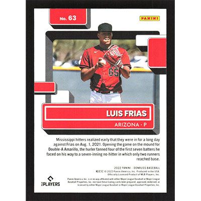 This is a 2022 Donruss Red Luis Frias Rated Rookie baseball card. The card is #63 and pictures show condition. This card is limited; #'d /2022. Team(s): Arizona Diamondbacks Rookie Card (RC)