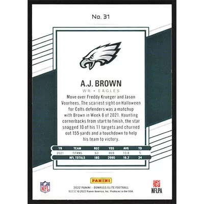 This is a 2022 Elite A.J. Brown football card. The card is #31 and pictures show condition.