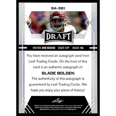 This is a 2022 Leaf Draft Autographs Slade Bolden football card. This card features an autograph of Slade Bolden, signed in blue, and is certified authentic by Leaf. The card is #BA-SB1 and pictures show condition.