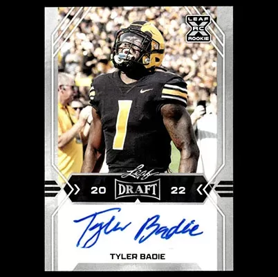This is a 2022 Leaf Draft Autographs Tyler Badie football card. This card features an authentic autograph of Tyler Badie, and is certified authentic by Leaf. The card is #BA-TB2 and is in NM-MT condition.