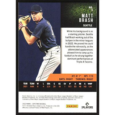 This is a 2022 Panini Capstone Matt Brash baseball card. The card is #5 and pictures show condition.