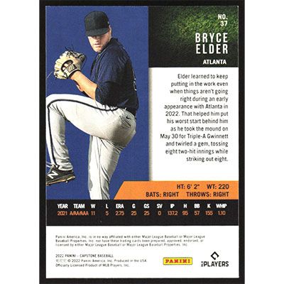This is a 2022 Panini Capstone Blue Bryce Elder baseball card. The card is #37 and pictures show condition. Team(s): Atlanta Braves Rookie Card (RC)