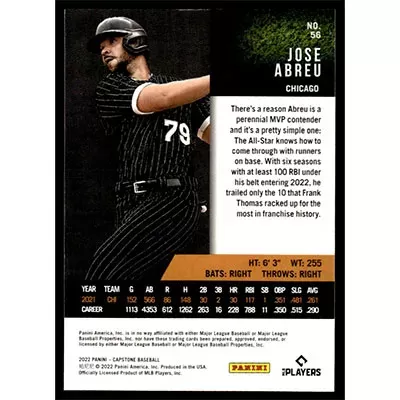 This is a 2022 Panini Capstone Blue Jose Abreu baseball card. The card is #56 and pictures show condition.