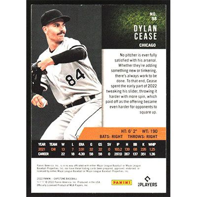 This is a 2022 Panini Capstone Blue Dylan Cease baseball card. The card is #98 and pictures show condition.