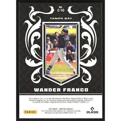 This is a 2022 Panini Capstone Crest Wander Franco baseball card. The card is #C-10 and pictures show condition. Team(s): Tampa Bay Rays Rookie Card (RC)