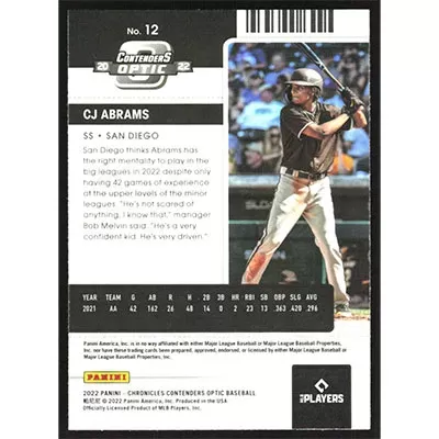This is a 2022 Panini Chronicles Contenders Optic CJ Abrams baseball card. The card is #12 and pictures show condition. Team(s): San Diego Padres Rookie Card (RC)