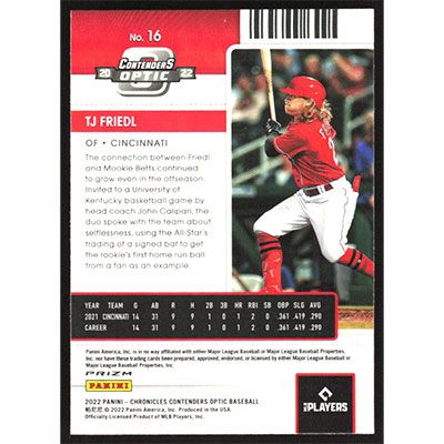 This is a 2022 Panini Chronicles Contenders Optic Holo TJ Friedl baseball card. The card is #16 and pictures show condition. Team(s): Cincinnati Reds Rookie Card (RC)