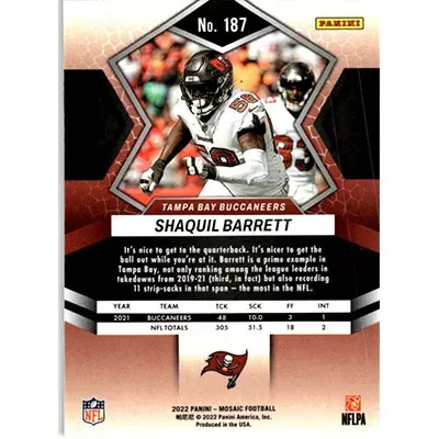 This is a 2022 Panini Mosaic Shaquil Barrett football card. The card is #187 and is in NM-MT condition.