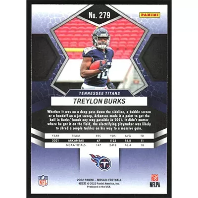 This is a 2022 Panini Mosaic Treylon Burks NFL Debut football card. The card is #279 and pictures show condition. Team(s): Tennessee Titans Rookie Card (RC)