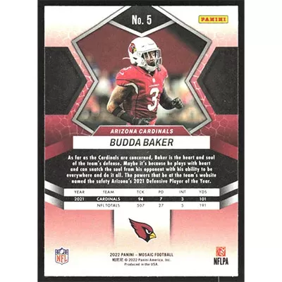 This is a 2022 Panini Mosaic Budda Baker football card. The card is #5 and pictures show condition.