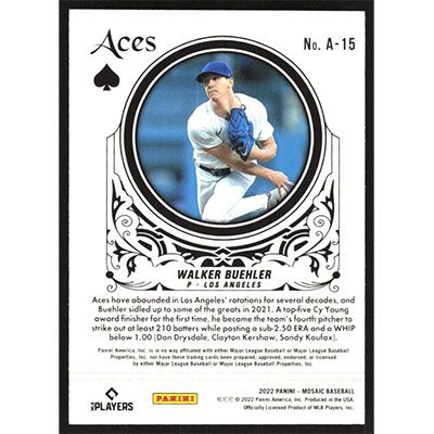 This is a 2022 Panini Mosaic Aces Walker Buehler baseball card. The card is #A-15 and pictures show condition.