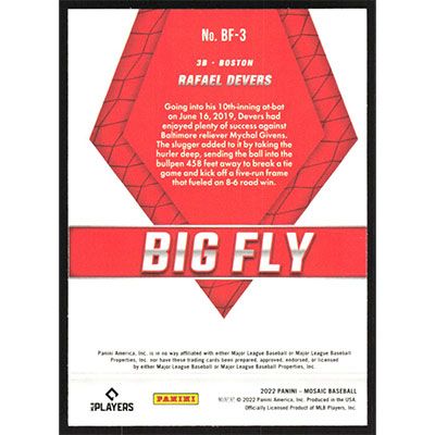 This is a 2022 Panini Mosaic Big Fly Rafael Devers baseball card. The card is #BF-3 and pictures show condition.