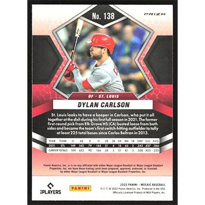 This is a 2022 Panini Mosaic Pink Camo Dylan Carlson baseball card. The card is #138 and pictures show condition.
