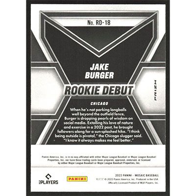 This is a 2022 Panini Mosaic Rookie Debut Green Jake Burger baseball card. The card is #RD-18 and pictures show condition. Team(s): Chicago White Sox Rookie Card (RC)
