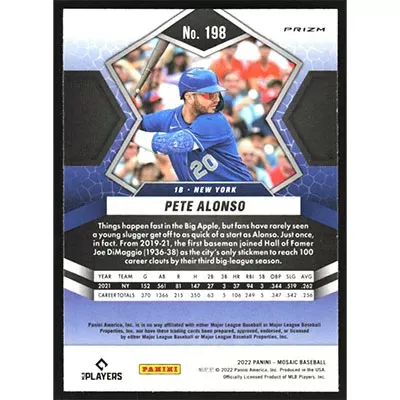 This is a 2022 Panini Mosaic Silver Prizm Pete Alonso baseball card. The card is #198 and pictures show condition.