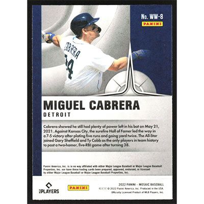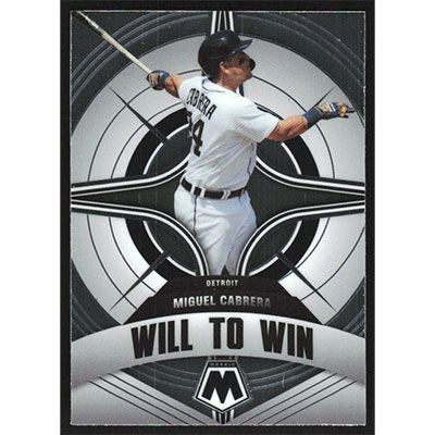 This is a 2022 Panini Mosaic Will to Win Miguel Cabrera baseball card. The card is #WW-8 and pictures show condition.