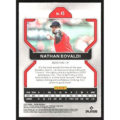 This is a 2022 Panini Prizm Nathan Eovaldi baseball card. The card is #45 and pictures show condition.