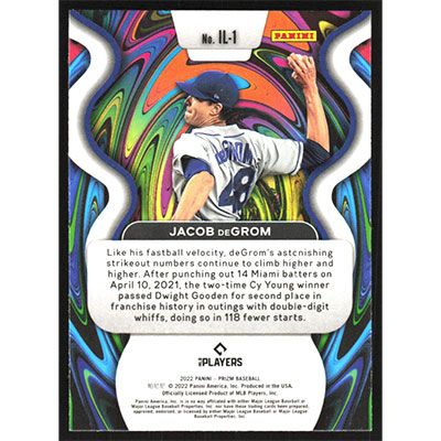 This is a 2022 Panini Prizm Illumination Jacob deGrom baseball card. The card is #IL-1 and pictures show condition.