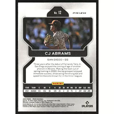 This is a 2022 Panini Prizm Purple CJ Abrams baseball card. The card is #12 and pictures show condition.