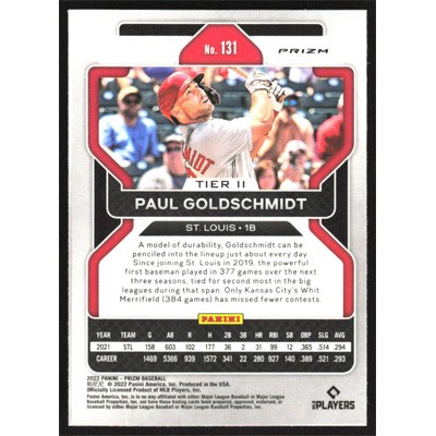 This is a 2022 Panini Prizm Purple Paul Goldschmidt Tier 2 baseball card. The card is #131 and pictures show condition.