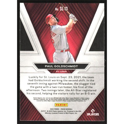 This is a 2022 Panini Prizm Sluggers Paul Goldschmidt baseball card. The card is #SL-13 and pictures show condition.